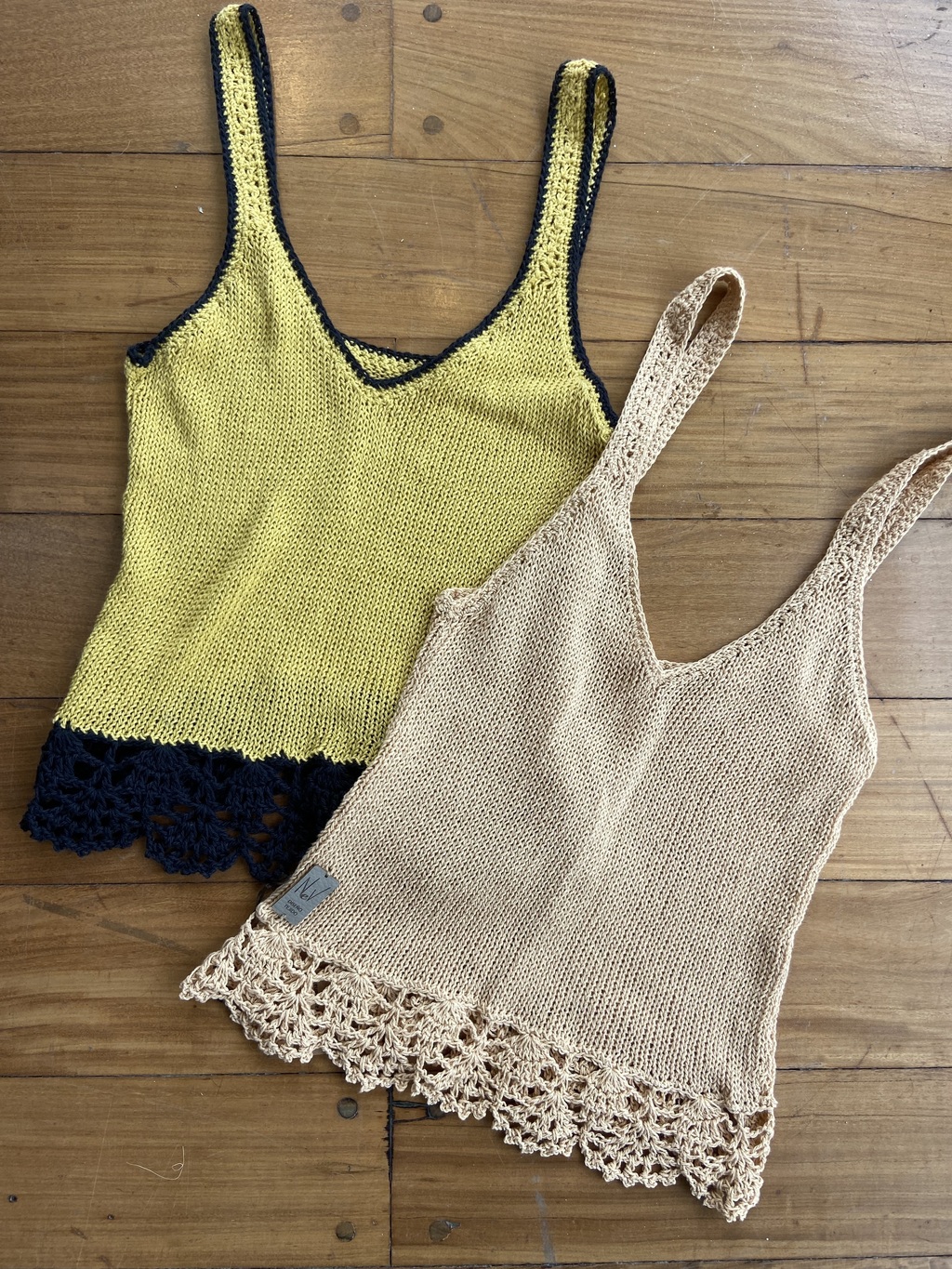 Musculosa Crochet Disponible en colores camel y verde con negro, esta musculosa terminada al crochet combina estilo artesanal con comodidad. Perfecta para el clima argentino, es fresca y versátil para cualquier ocasión.